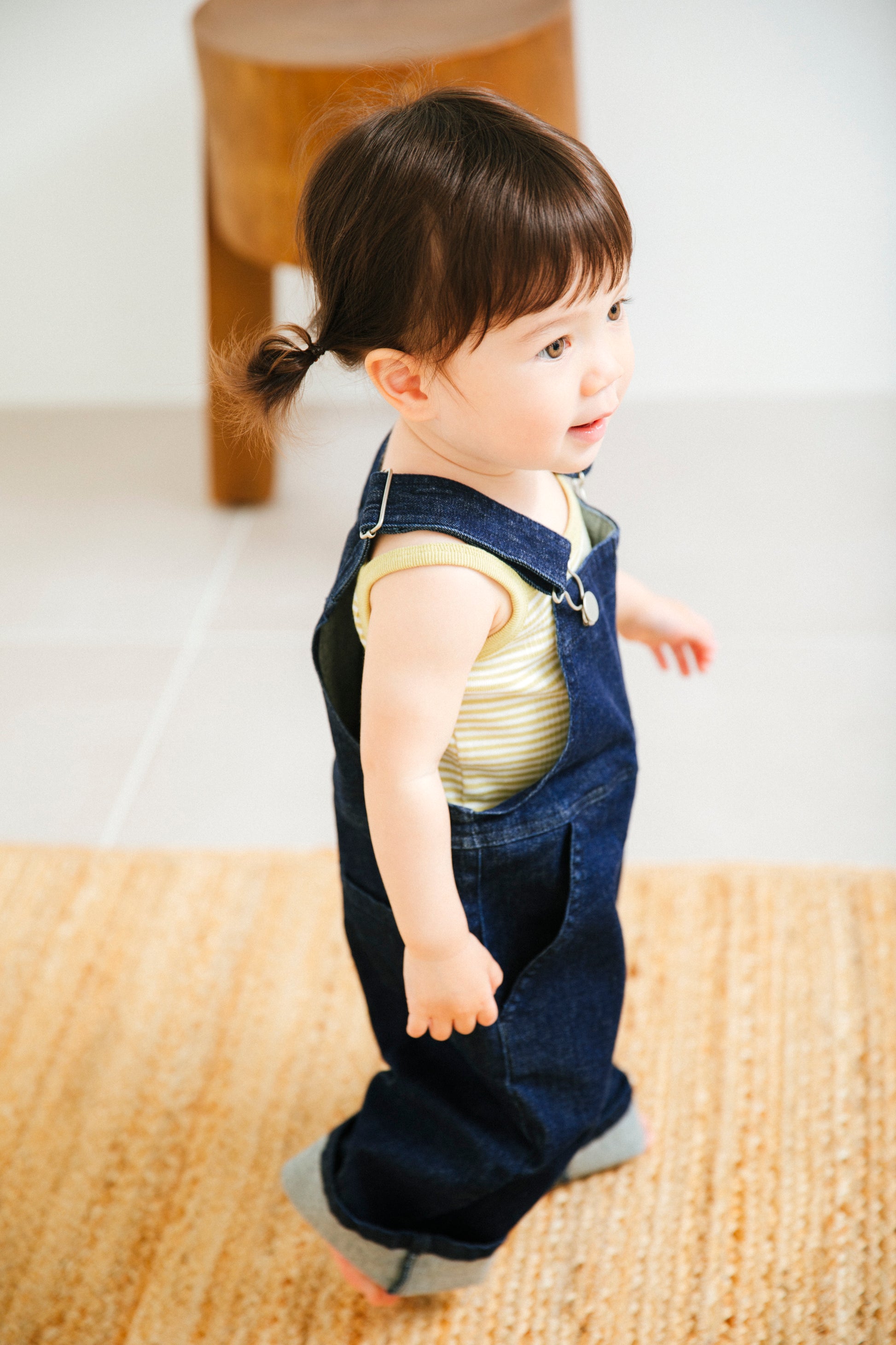 程よいストレッチ感のあるデニム素材のオーバーオールは、アクティブなキッズの動きを邪魔せず、着脱しやすいのも嬉しいポイント。