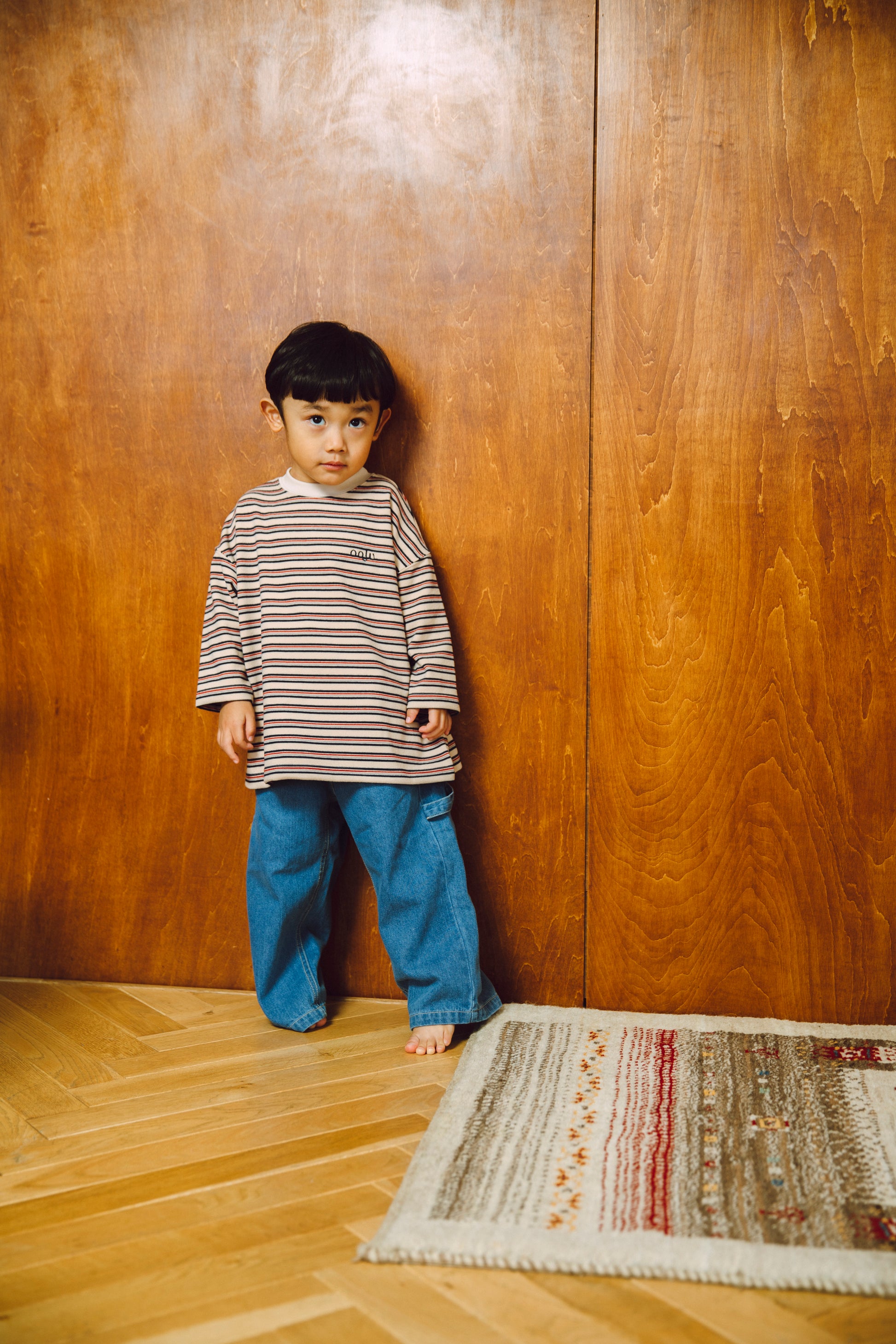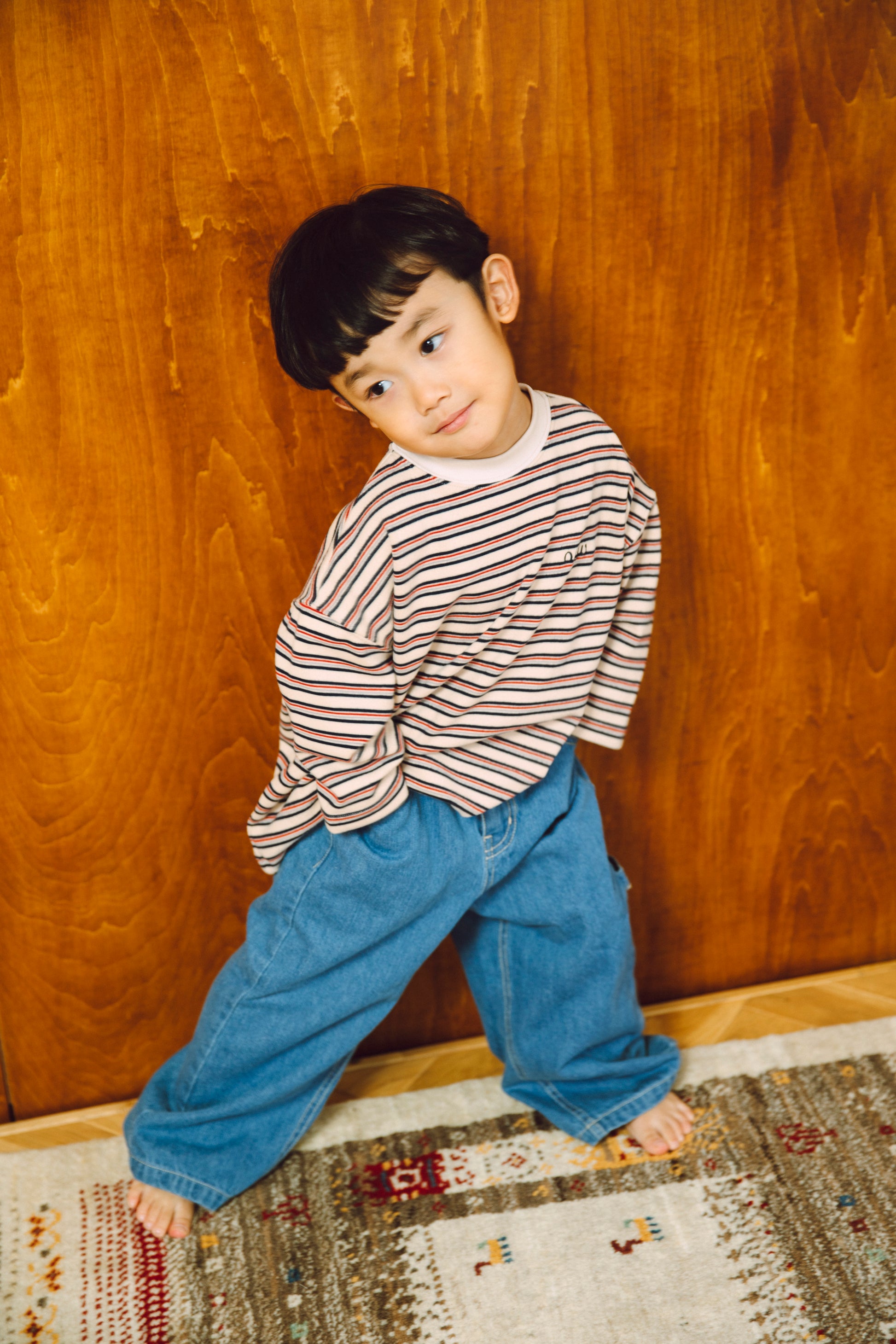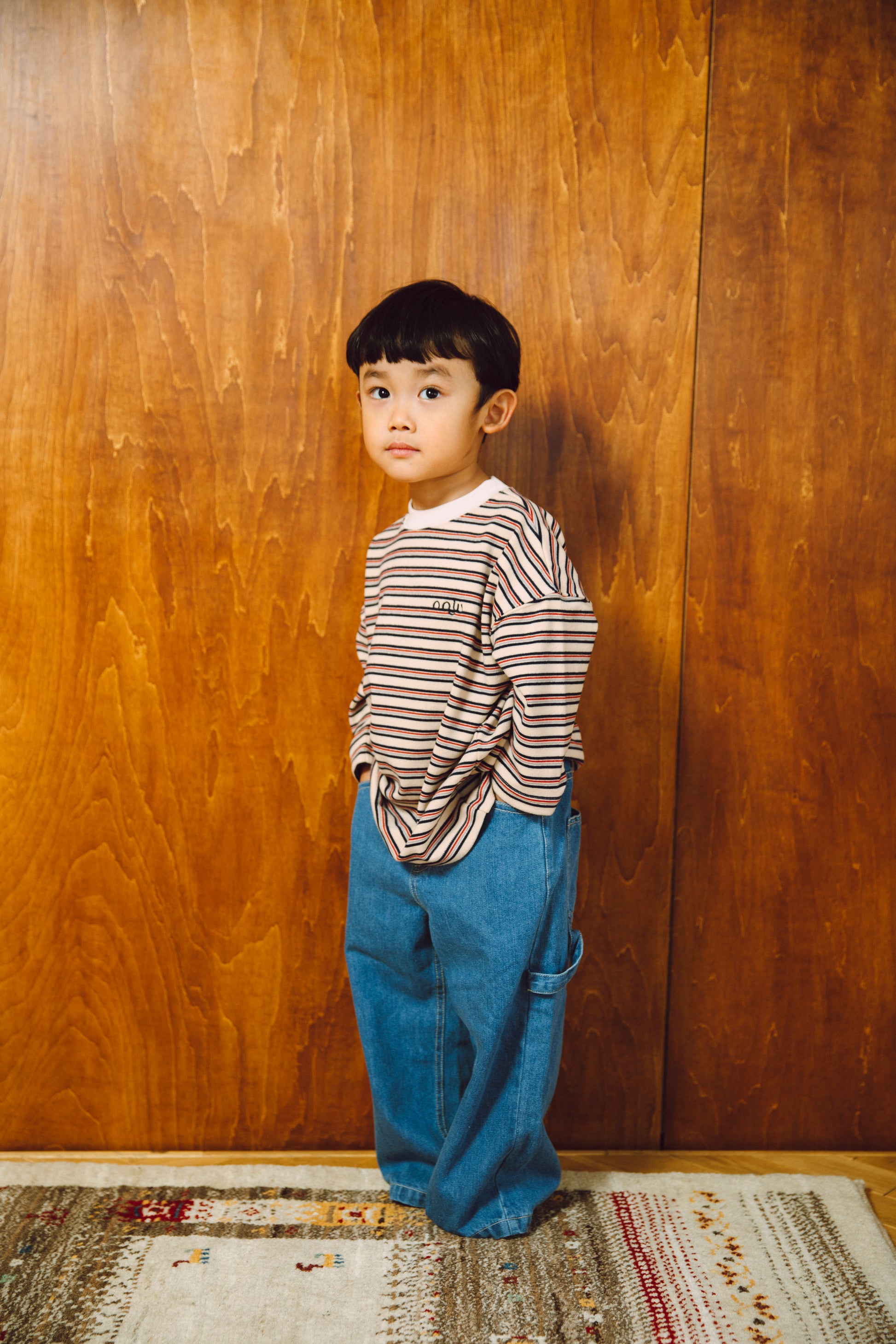 レトロでインパクトのあるマルチボーダーなので、秋冬のコーディネートの主役になる1枚です。